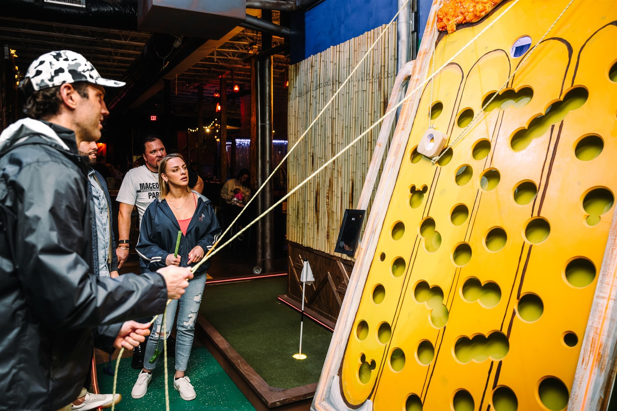 Mini golf with a puzzling twist. Our course has built in booby traps so you can mess up your opponents game.